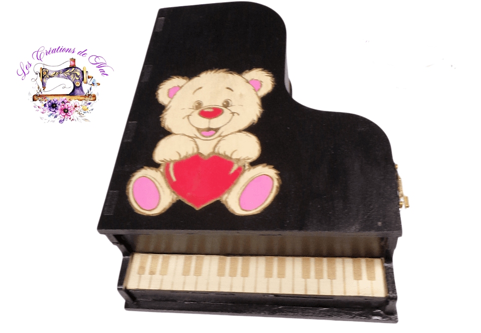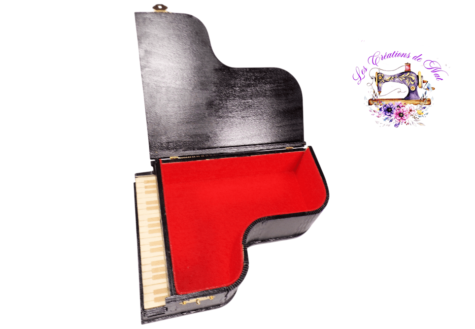 Boite en forme de piano à queue, découpée et gravée au laser, intérieur en feutrine rouge.