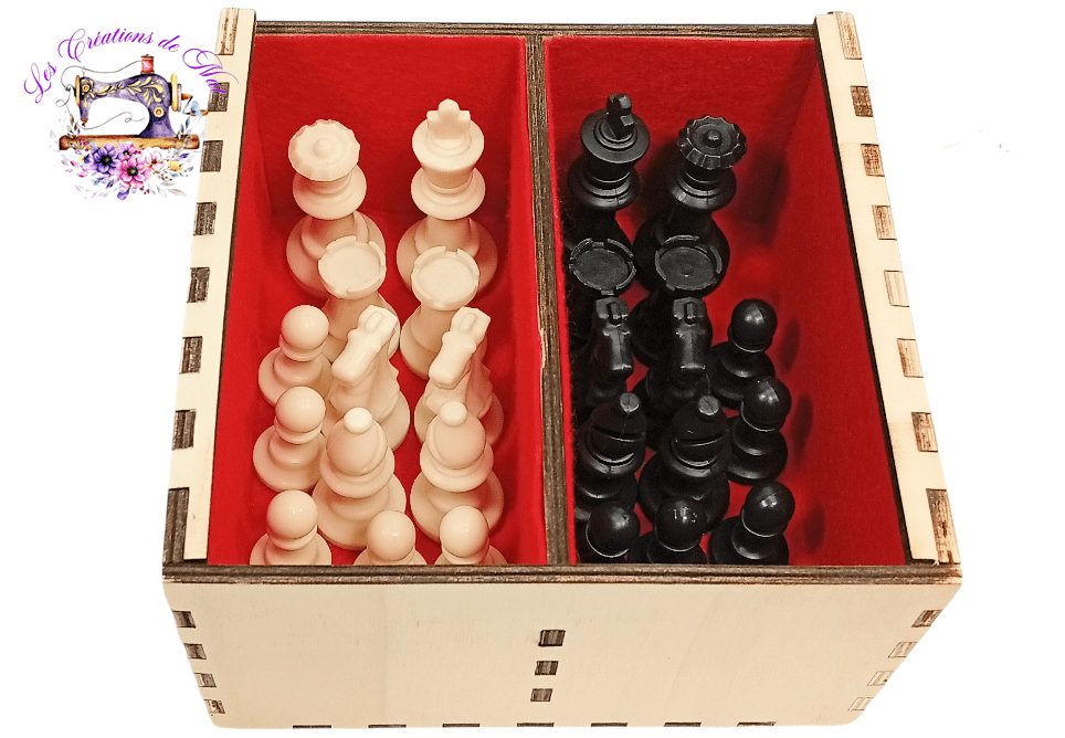 Echiquier bois gravé et découpé au laser, vendu avec un coffret bois de 32 pions en pvc.