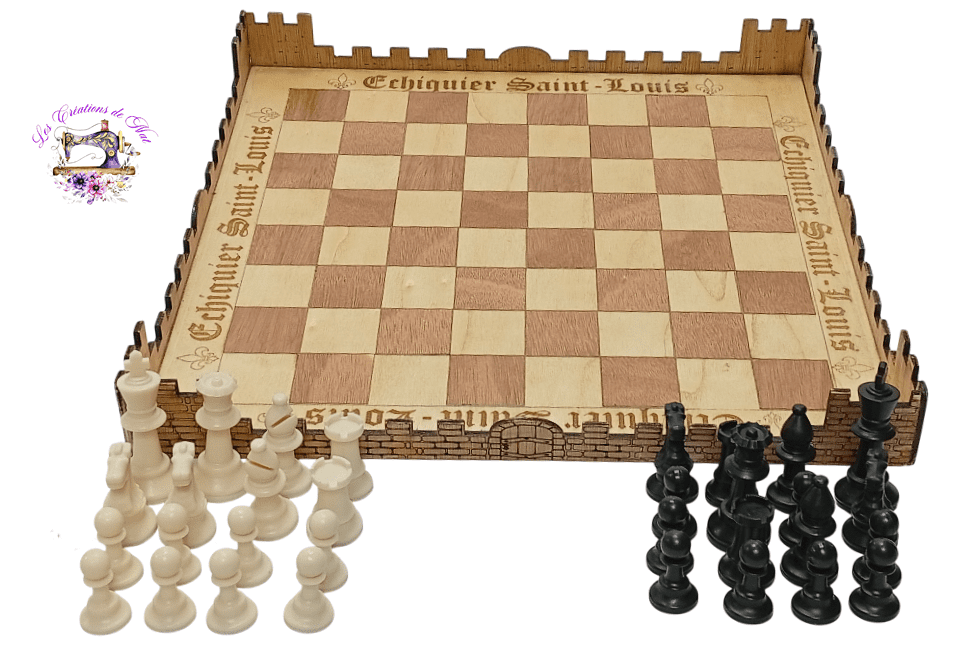 Echiquier bois "Saint Louis" gravé et découpé au laser, avec 32 pions pvc.