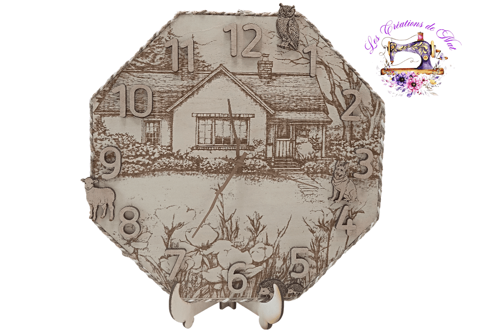 Grande horloge à quartz, gravée et découpée au laser, crochet au dos.