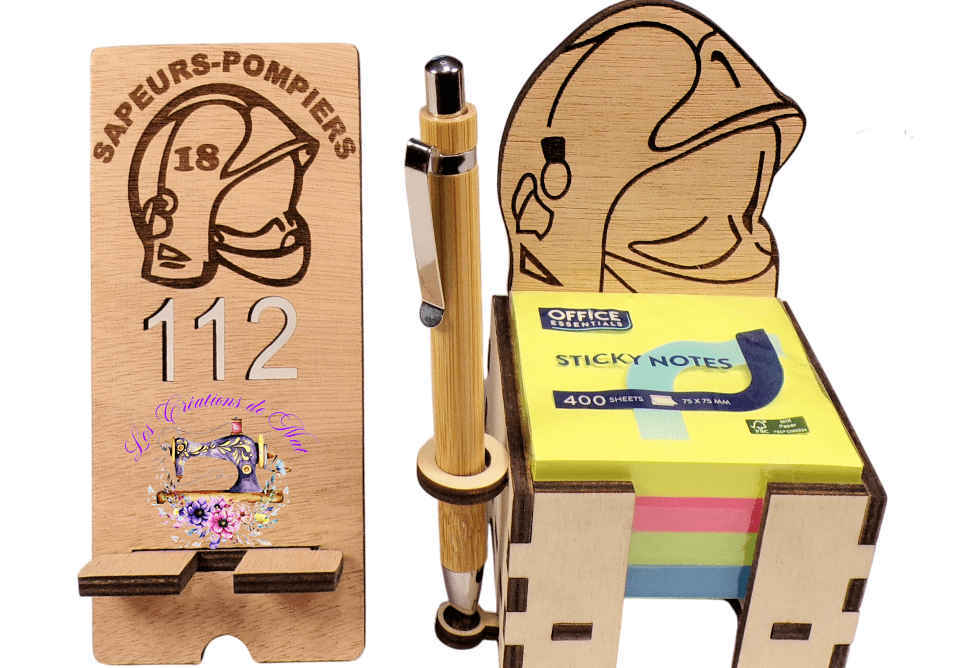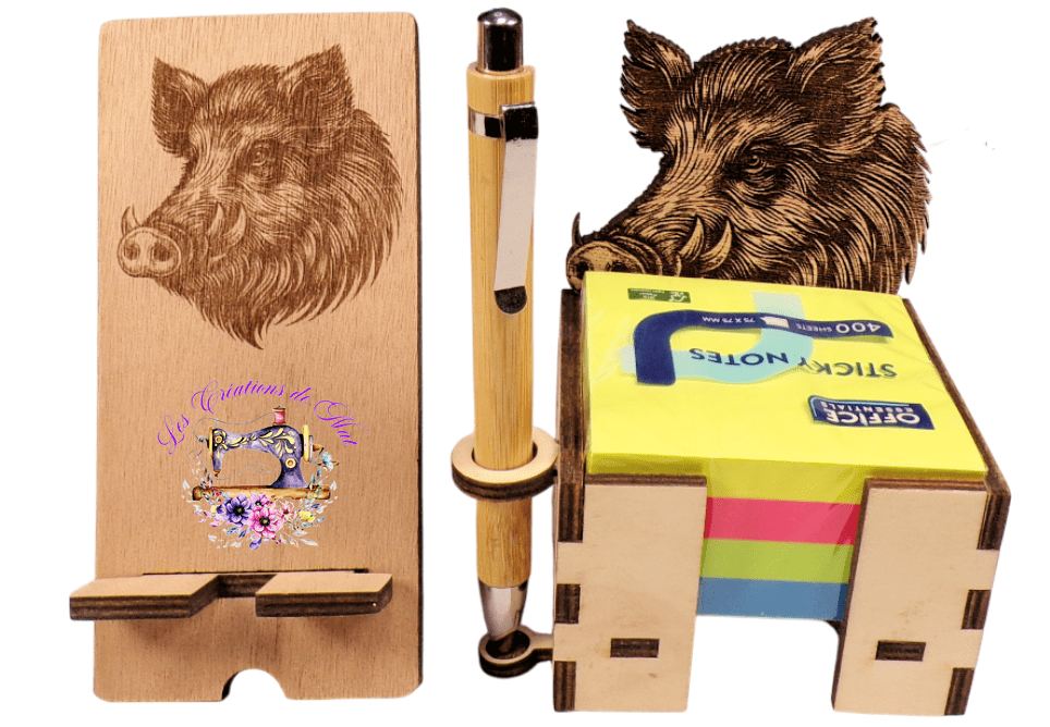 Matières : Peuplier de 5mm gravé et découpé au laser, stylo en bambou.
