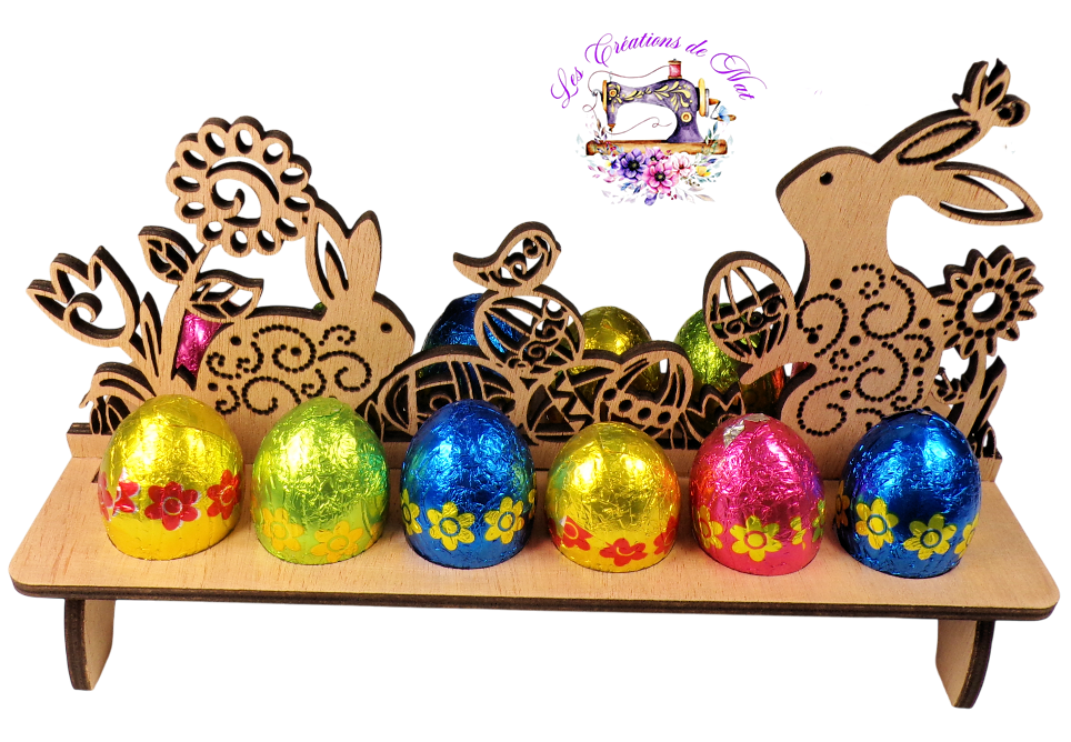 Porte-oeufs avec scène de Pâques, 12 trous de diamètre 28mm, entièrement en contreplaqué d'Okoumé de 5mm, découpé au laser.